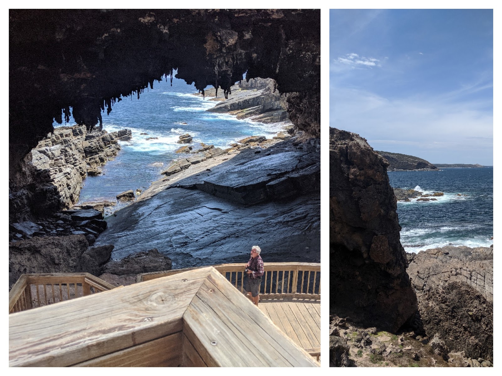 Next stop Admirals Arch located at Cape du Couedic where another beautiful lighthouse stands. There are cottages here you can stay in overnight if you can afford them. As you traverse the boardwalk down to the beautiful natural rock arch you can enjoy the antics of sea lions, Australian long-nosed fur seals and New Zealand fur seal as they surf in on the waves and lounge around on the smooth rock ledges. They appear so graceful and playful in the water and then so inelegant and labored on land.